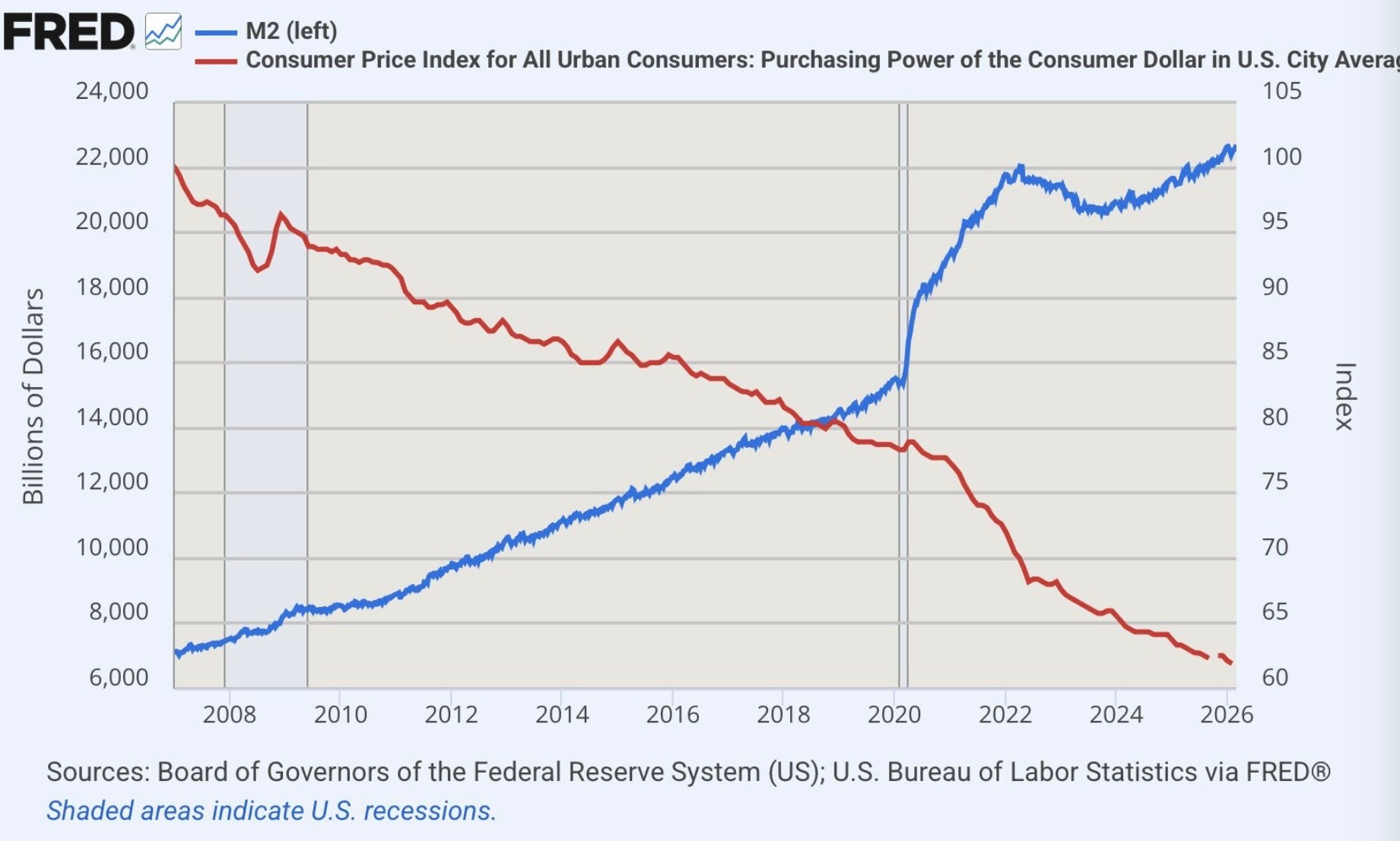 La razón fundamental para permanecer invertido en bolsa es la pérdida de capacidad de compra por el efecto inflacionario y crecimiento de la M2. El gráfico adjunto muestra esta situación en EEUU, que se manifiesta de igual forma en todos los países desarrollados. En definitiva, no aconsejo nunca salirse del mercado al 100%.