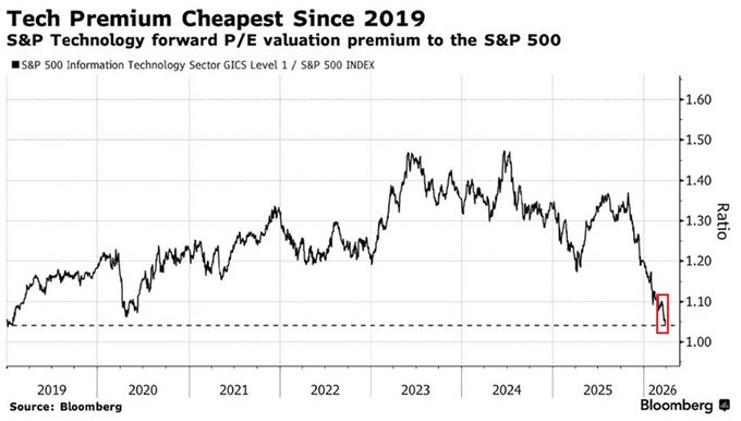 Desde finales del 2025, las posiciones tecnológicas (especialmente Microsoft y Alphabet) han lastrado la rentabilidad del fondo, debido a un ajuste de valoración muy fuerte. Como muestra el gráfico inferior, la prima de valoración queda en mínimos de los últimos años: