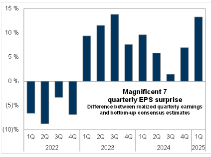 Los beneficios empresariales del primer trimestre mostraron señales positivas, donde las empresas europeas informaron resultados un 5% por encima de las bajas expectativas iniciales en promedio. En EE.UU, el BPA del S&P 500 creció un 12% frente al consenso del 6% (la empresa mediana creció un +6%). Sin embargo, hubo mucha incertidumbre en los informes de resultados, ya que muchas empresas modificaron sus previsiones debido a la incertidumbre arancelaria. Si observamos el BPA trimestral de las MAG 7, éste fue sorprendentemente el mayor desde el tercer trimestre de 2023 y debería poder seguir superando las expectativas, ya que esto a menudo se considera un «indicador de crecimiento defensivo».
